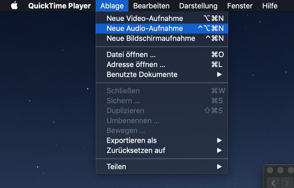 - Klicken Sie auf „Ablage“ und dann „Neue Audio-Aufnahme“