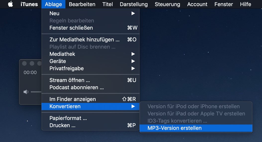 - Unter „Ablage“ -> „Konvertieren“ können Sie jetzt eine mp3-Version erstellen, die bei iTunes neben Ihrer alten Datei auftaucht.