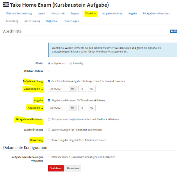 Bedingung: Im Tab "Workflow" des Aufgabenbausteins müssen Sie bei "Rückgabe und Feedback" einen Haken gesetzt haben.