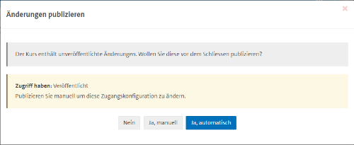 Wenn Sie Änderungen im Kurseditor vorgenommen haben und den Editor verlassen, wird Ihnen direkt vorgeschlagen, zu Publizieren. Sie können jetzt entweder alle bisherigen Änderungen auf einmal wirksam werden lassen (Schaltfläche "Ja, automatisch"), oder nur manche davon (Schaltfläche "Ja, manuell"). Sie können die Publikation aber auch aufschieben ("Nein"), dann merkt OpenOlat sich alle Änderungen für einen späteren Publikationsvorgang (möglich via Toolbar im Kurseditor). Alle Personen mit der Kursrolle "Besitzer" sehen im Kurseditor stets die seit dem letzten Publizieren vorgenommenen Änderungen.