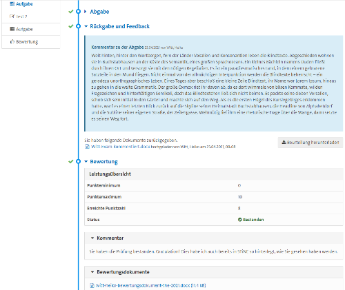 Möglich ist eine Bewertung in Form von Punkten, über Bestanden / Nicht Bestanden und mittels individuellem Feedback. Eingesehen werden kann die gegebene Bewertung nur von dem jeweiligen Benutzer.