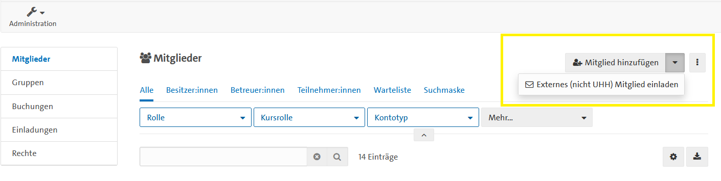 Externe Einladung: Kursbesitzende können über die Funktion Externes (nicht UHH) Mitglied einladen Personen in ihren Kurs einladen, die keine UHH-Kennung besitzen.Diese Funktion finden Sie über die Kursadministration >Migliederverwaltung> Dropdown Menü oben rechts neben Mitglied Hinzufügen.