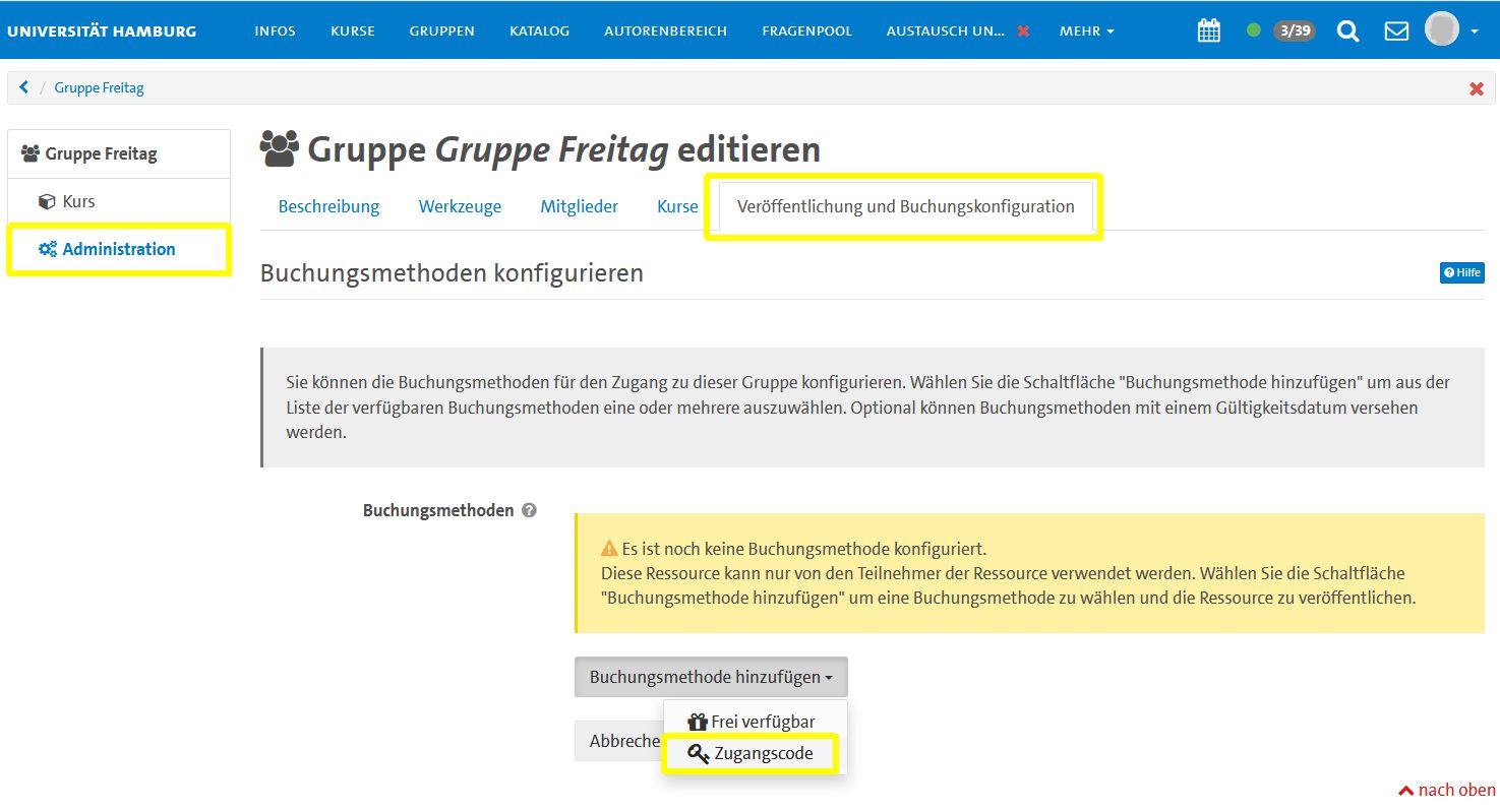 Als dritte Möglichkeit können Sie über den Tab "Veröffentlichung und Buchungskonfigration" einen Zugangscode für die Gruppe einrichten bzw. die Gruppe frei verfügbar machen: