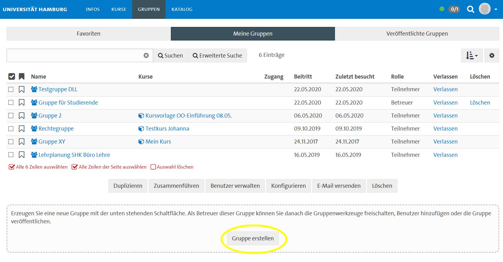 Gruppen können von Studierenden angelegt und z. B. im Rahmen einer Lerngruppe genutzt werden, sie können aber auch von Lehrenden mit Kursen verknüpft zur Kleingruppenarbeit eingesetzt werden.