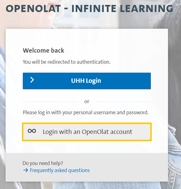 Kursbesitzende können über die Funktion Externes (nicht UHH) Mitglied einladen Personen in ihren Kurs einladen, die keine UHH-Kennung besitzen. Die eingeladenen Personen bekommen eine Benachrichtigung und können sich, wie im vorigen Anmeldeverfahren Mit Konto anmelden, in OpenOlat einloggen.