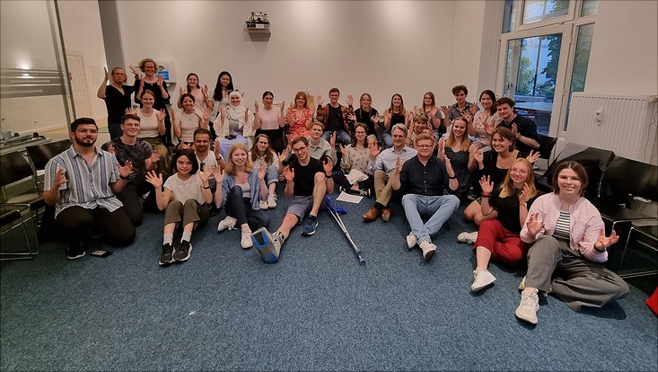 Around 200,000 people in Germany use German Sign Language; about 80,000 of them are deaf (source: Bundesfachstelle Barrierefreiheit). Britta Harms and Alexander Eisenzimmer, both research associates and certified sign language interpreters at the University of Hamburg, led a workshop where scholarship recipients practiced basic sign language and got a feel for nonverbal communication. Due to strong interest, another introductory sign language course will be offered in Winter Semester 2024/25.