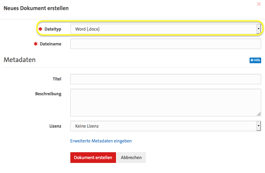 - The Create new document window opens. Select the desired file type Word, Excel, or PowerPoint in this form, name the file, and then click on Create document.