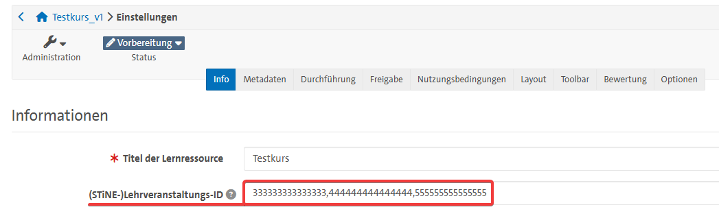 - Copy the (STiNE) Lecture ID from STiNE in the line Veranstaltungsdetails (Event details) on the right (e.g., 391265184237051) and paste this number in OpenOLAT under Administration -> Settings -> Info into the field (STiNE) Lecture ID and save your changes at the bottom of the page.