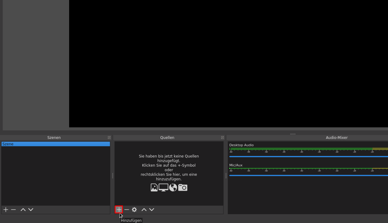 - Click on the '+' symbol next to Sources (see Figure obs-source-add) to add sources to the default scene.