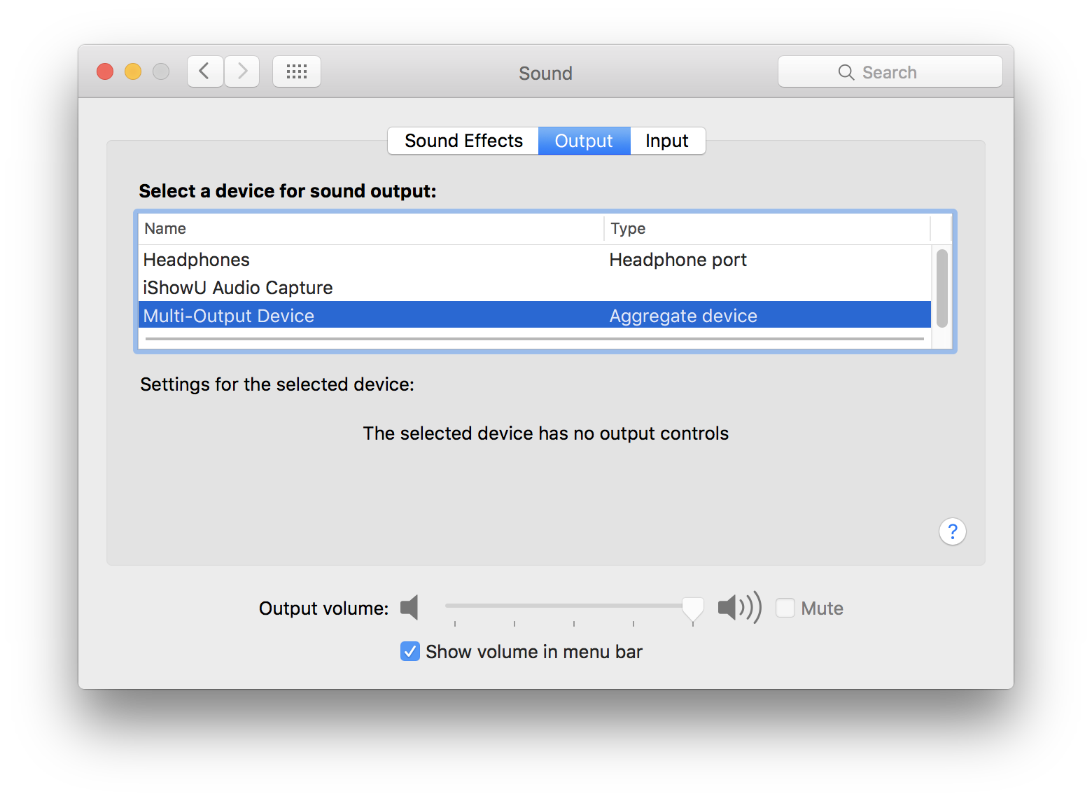 Go back to System Preferences > Sound. Here you will find the Multi-Output Device. Before selecting the Multi-Output Device, you should briefly adjust your volume, as the volume cannot be increased or decreased from Multi-Output Devices.