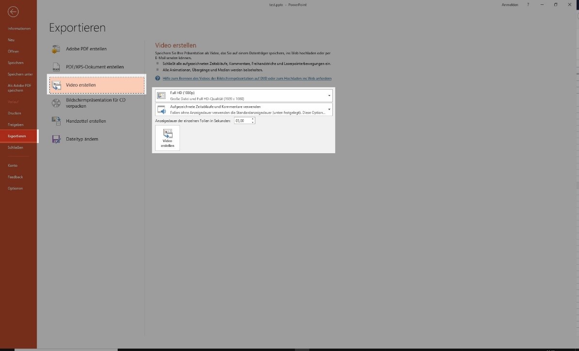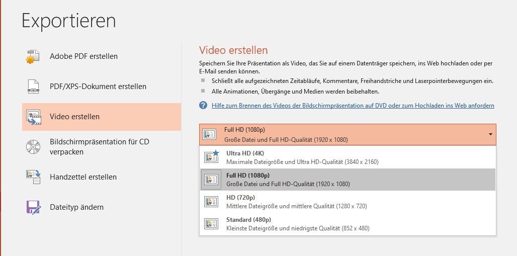 Here, you can select the video resolution before exporting and decide whether recordings and comments (markers, pens, laser pointers) should be exported (default: "Use Recorded Timings and Narrations"). At standard quality, the used storage space is up to 4 MB per minute.