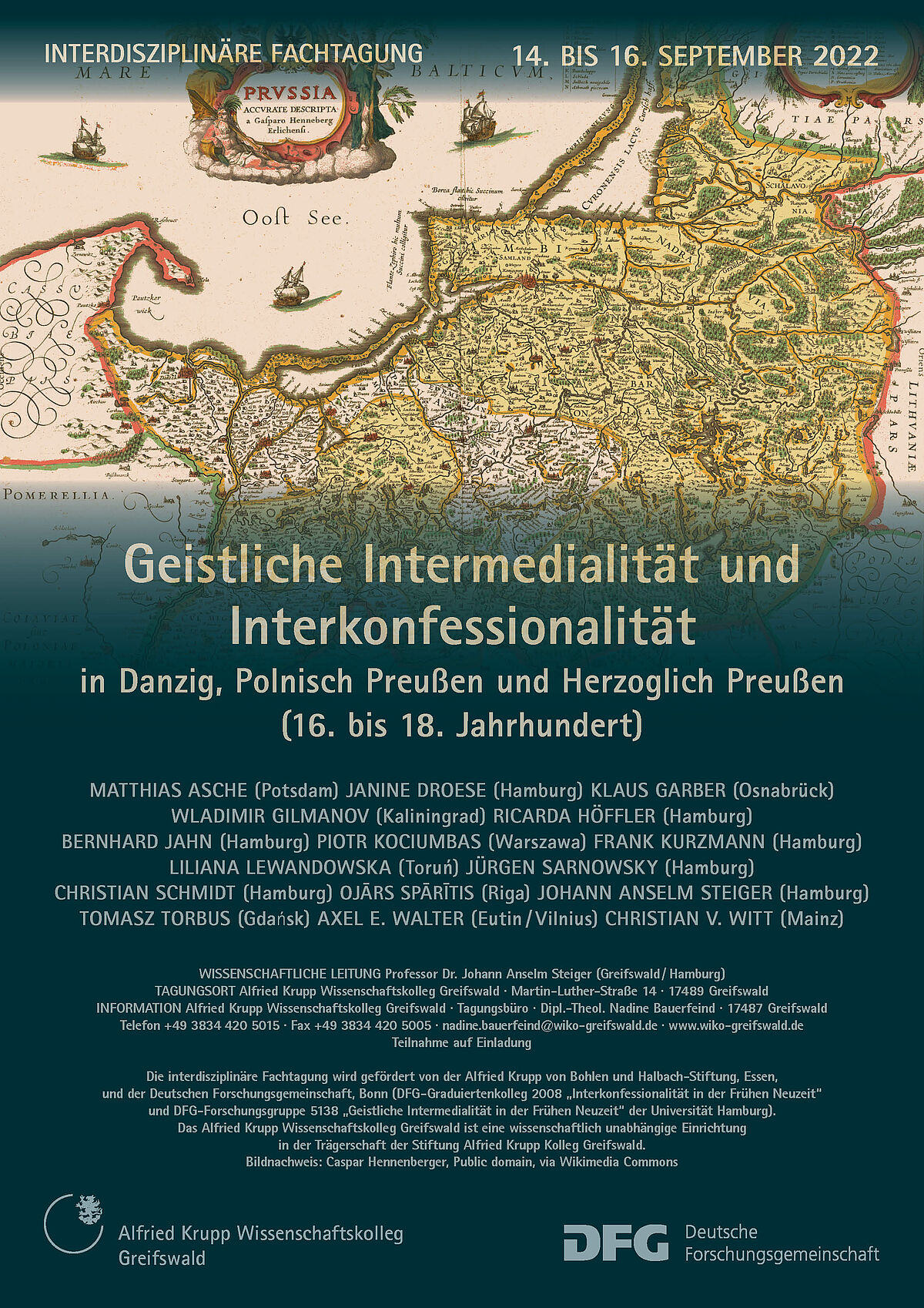 - 13.-16.09.2022: „Geistliche Intermedialität und Interkonfessionalität in Danzig, Polnisch Preußen und Herzoglich Preußen (16. bis 18. Jahrhundert)“ Internationale Tagung des Alfried Krupp Wissenschaftskollegs Greifswald in Kooperation mit dem GRK 2008 und der FOR 5138, Greifswald.