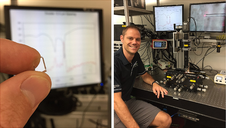 During a research stay of one Universität Hamburg staff member at Macquarie University the first Yb:YAG DFB waveguide laser chip was fabricated (figure 1) together with Martin Ams from CUDOS at Macquarie University, measuring the transmission spectrum of this device in figure 2.
