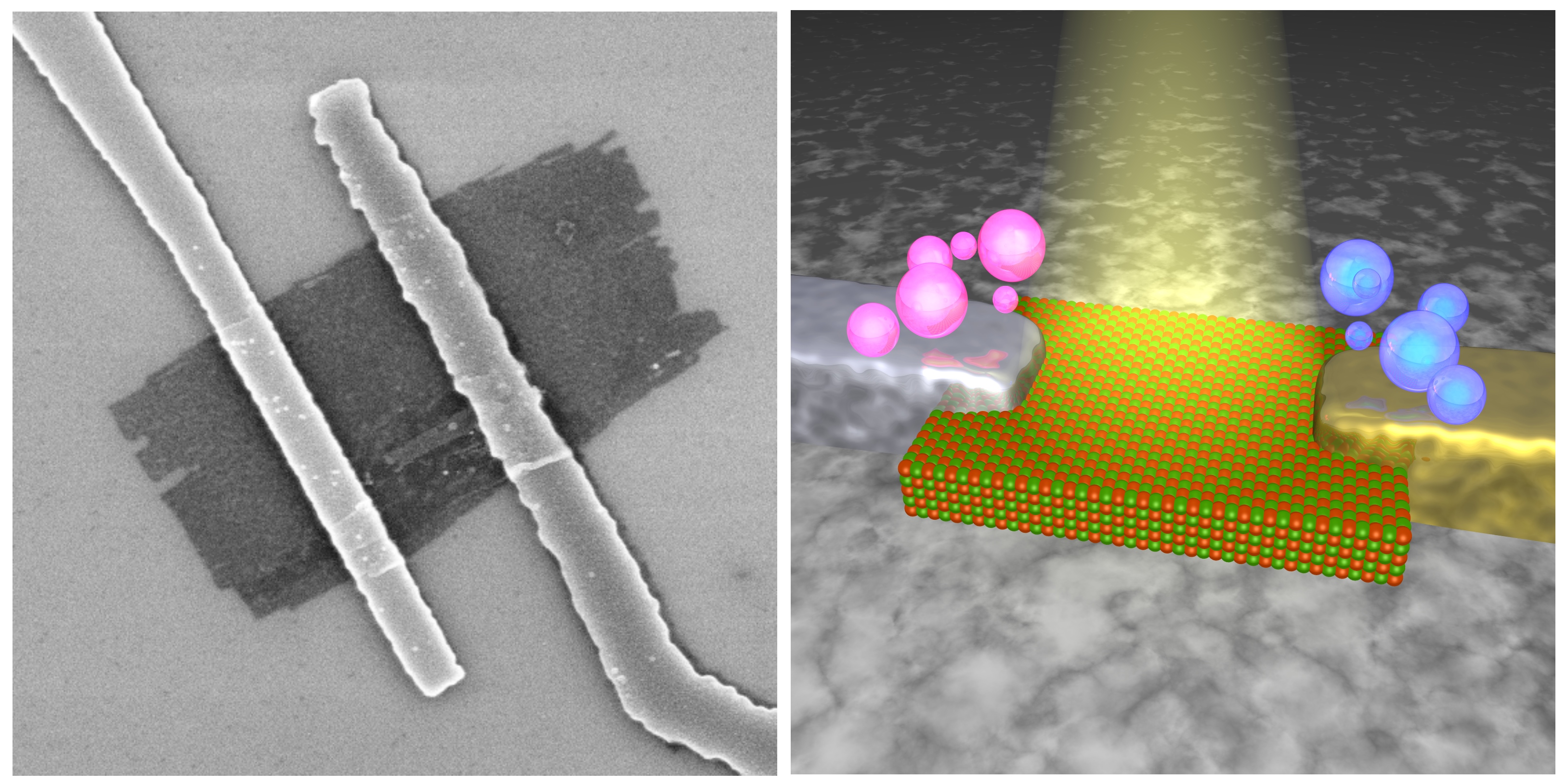 (links) Elektronenmikroskopische Aufnahme einer Solarzelle, die aus einem zweidimensionalen Bleisulfid-Nanokristall besteht und mit zwei unterschiedlichen Metall-Elektroden kontaktiert ist (Titan/Platin). (rechts) Schema der Solarzelle. Die Blasen über den Kontakten stellen die erzeugten positiven und negativen Ladungen dar.