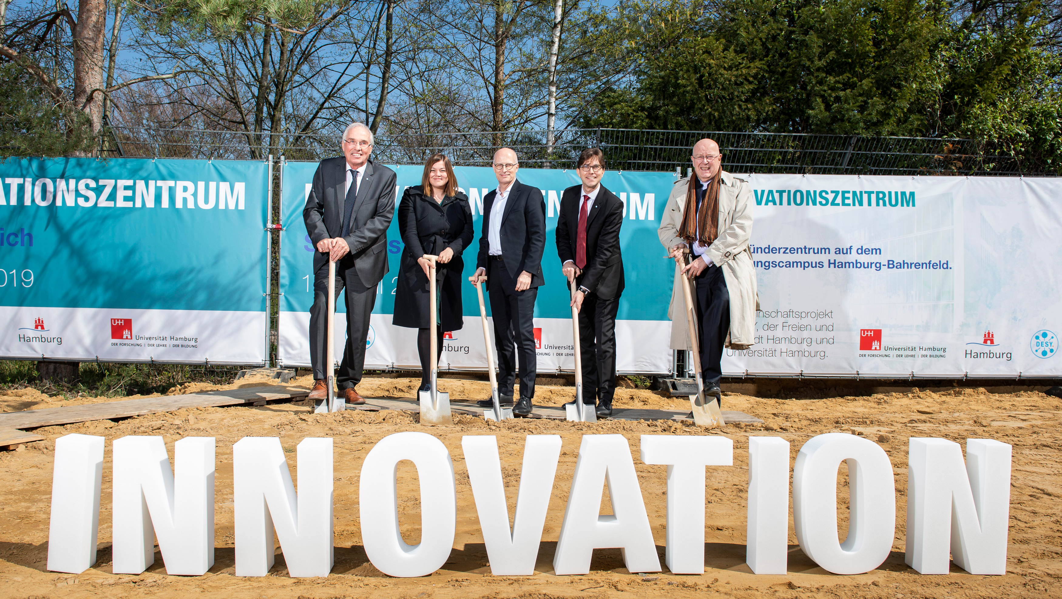 With a symbolic breaking of the ground, Hamburg’s first mayor, Dr. Peter Tschentscher, the city’s second mayor and senator for science and research, Katharina Fegebank, the chair of the DESY Board of Directors, Prof. Dr. Dr. h. c. Helmut Dosch, the president of Universität Hamburg, Prof. Dr. Dr. h. c. Dieter Lenzen, and DESY’s chief technology officer, Dr. Arik Willner, launched construction works on the Innovation Centre.