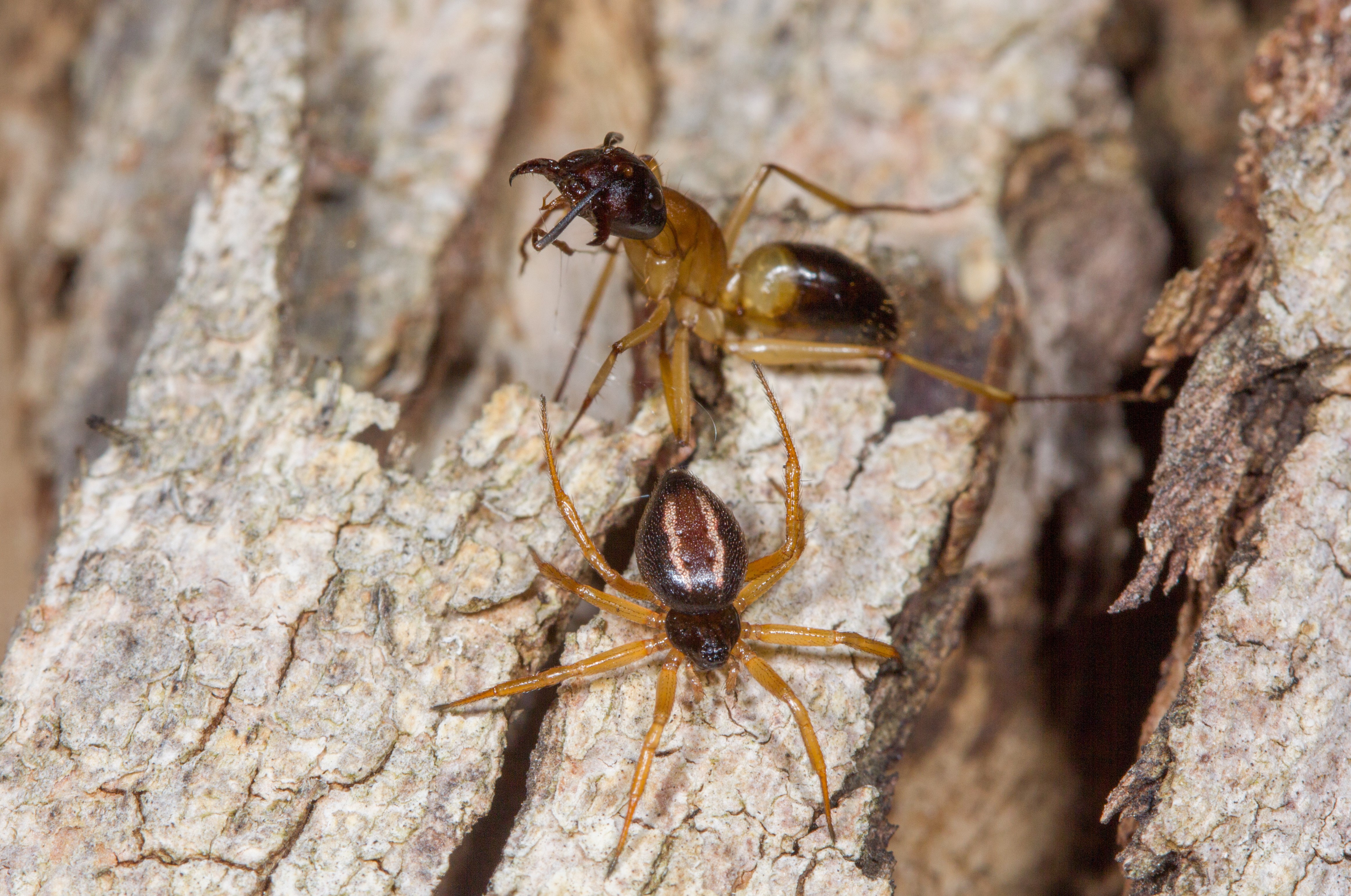 The Australian ant-slayer Euryopis umbilicata lives on the trunks of eucalyptus trees and hides under the bark during the day. At dusk, it emerges to hunt along the trunk. Behavioral analyses conducted by German and Australian researchers now show in detail, how this type of spider uses its hunting technique to capture even the ferocious camponotus ants without becoming prey itself.