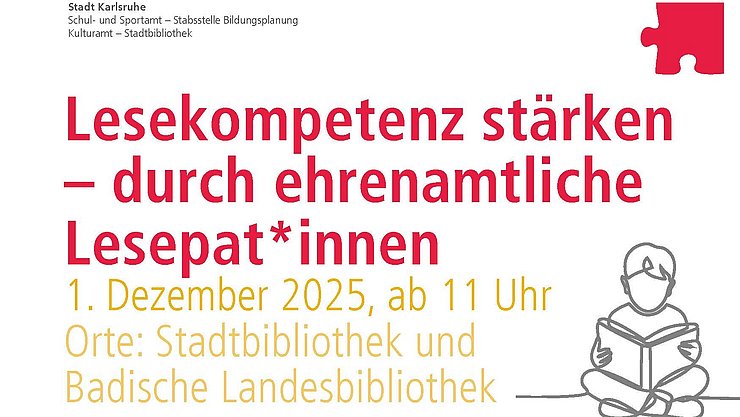 Unter dem Motto „Lesekompetenz stärken – durch ehrenamtliche Lesepatinnen und -paten“ findet am 1. Dezember ab 11 Uhr im Rahmen der Bildungsregion Karlsruhe ein gemeinsamer Fachtag mehrerer Bildungsinstitutionen statt. Auch die Pädagogische Hochschule Karlsruhe ist mit dabei und ihre Studierenden herzlich willkommen.