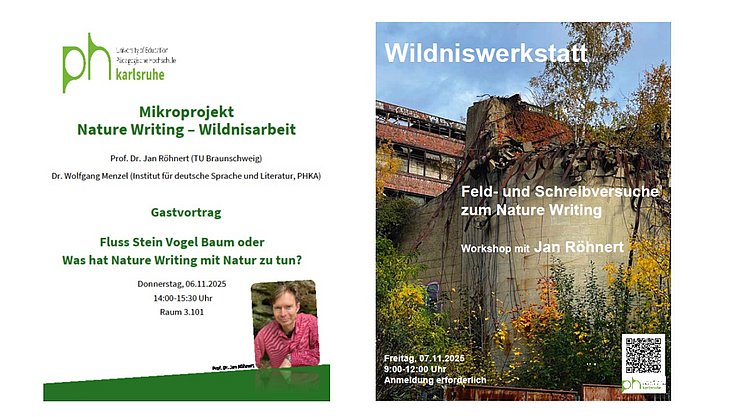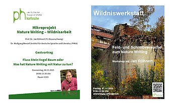 Am Freitag, 7. November folgt von 9:00 bis 12:00 Uhr ein Workshop mit Jan Röhnert: "Feld- und Schreibversuche zum Nature Writing." Der Workshop ist ebenfalls hochschulöffentlich für Studierende aller Fakultäten, allerdings ist eine Anmeldung erforderlich und die Teilnehmendenzahl ist auf 25 begrenzt.