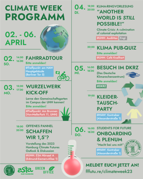 Auch zu Beginn des Sommersemesters 2023 haben wir wieder in Kooperation mit den Students for Future und den UHH und HAW Asten eine Themenwoche zur Klimakrise organisiert. Es gab ein breites Programm von einer Fahrradtour, über ein Pub Quiz bis hin zu einer Podiumsdiskussion des neusten "Hamburg Climate Future Outlooks".