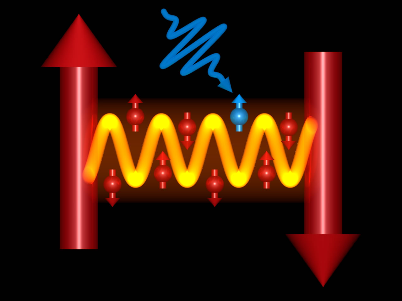 Künstlerische Darstellung der Beeinflussung von Licht durch magnetische Kräfte. Ein Laserpuls regt Elektronen an, die dann die Wechselwirkung der „Spins“ ändern.