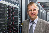 RRZ-Direktor Prof. Dr.-Ing. Stephan Olbrich vor dem neuen Hochleistungsrechner