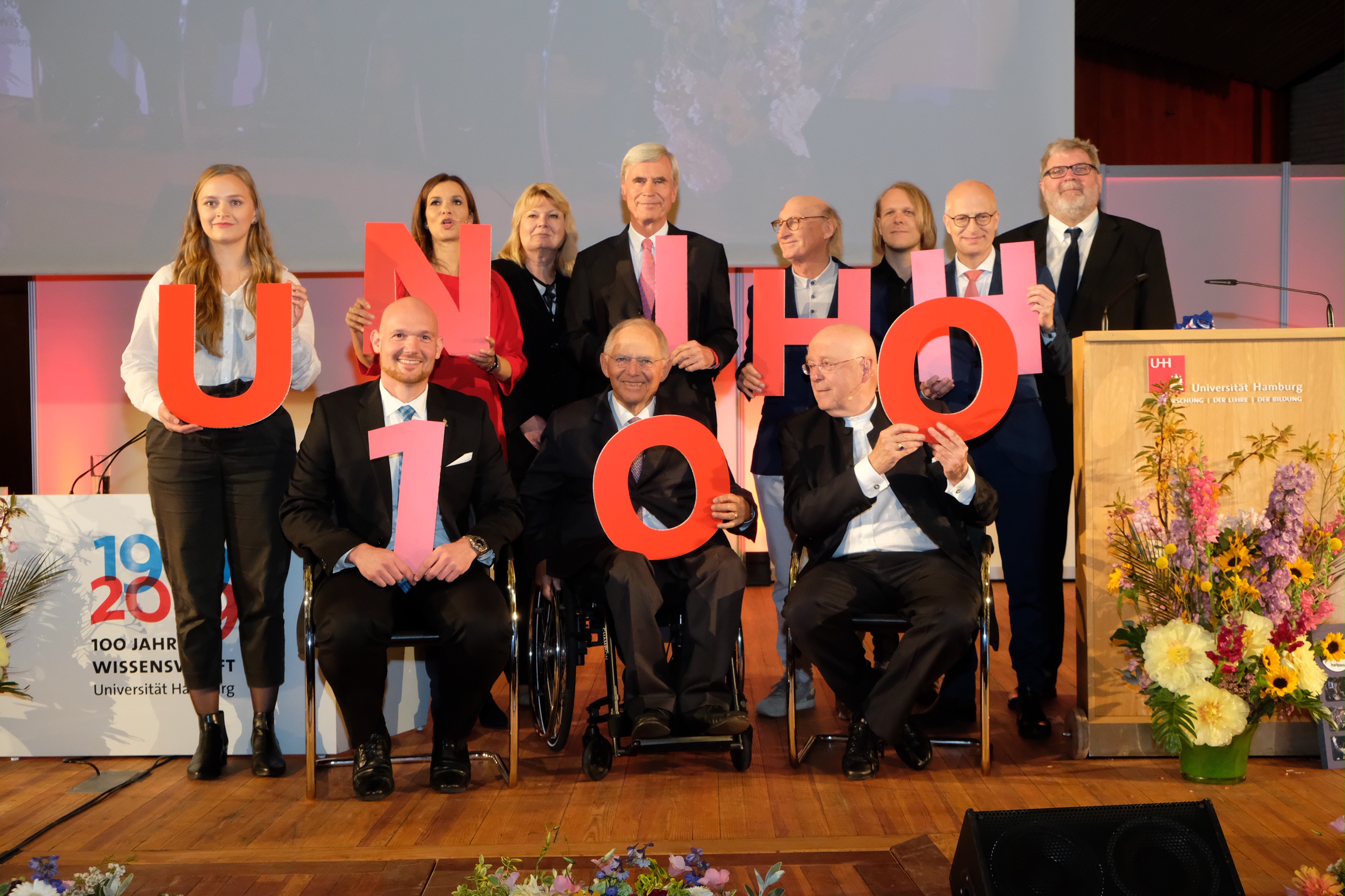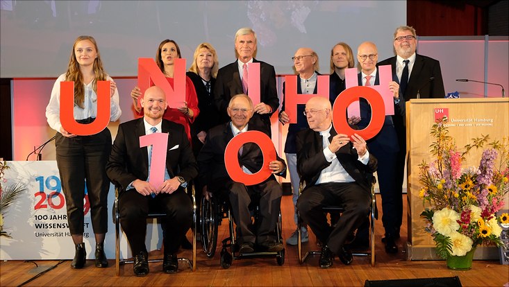Den Auftakt der Feierlichkeiten bildete der Festakt im Audimax. 1.400 Gäste feierten gemeinsam ein Jahrhundert Universität Hamburg: Studierende, Mitarbeiterinnen und Mitarbeiter, Lehrende und Alumni waren ebenso anwesend wie Mitglieder vieler internationaler Partnerhochschulen und anderer Wissenschaftseinrichtungen aus ganz Deutschland. Zudem kamen zahlreiche Vertreterinnen und Vertreter aus Politik, Wirtschaft, Kirche und Kultur sowie Gesellschaft zu der Veranstaltung im Audimax.
