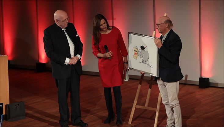 Im Anschluss betraten zwei weitere Alumni der Universität die Bühne: Professor Michael Otto, ebenfalls Ehrensenator, erinnerte sich im Gespräch mit der Moderatorin der Veranstaltung, NDR-Journalistin und Alumna Julia Sen, an seine Zeit an der Universität und berichtete, welche Bedeutung sie für ihn als Vorsitzenden eines Familienunternehmens hat. Zudem überreichte der Künstler und Komiker Otto Waalkes Universitätspräsident Lenzen das Bild eines „Unifanten“ – ein eigens zum Jubiläum abgewandeltes Bild seines „Ottifanten“.