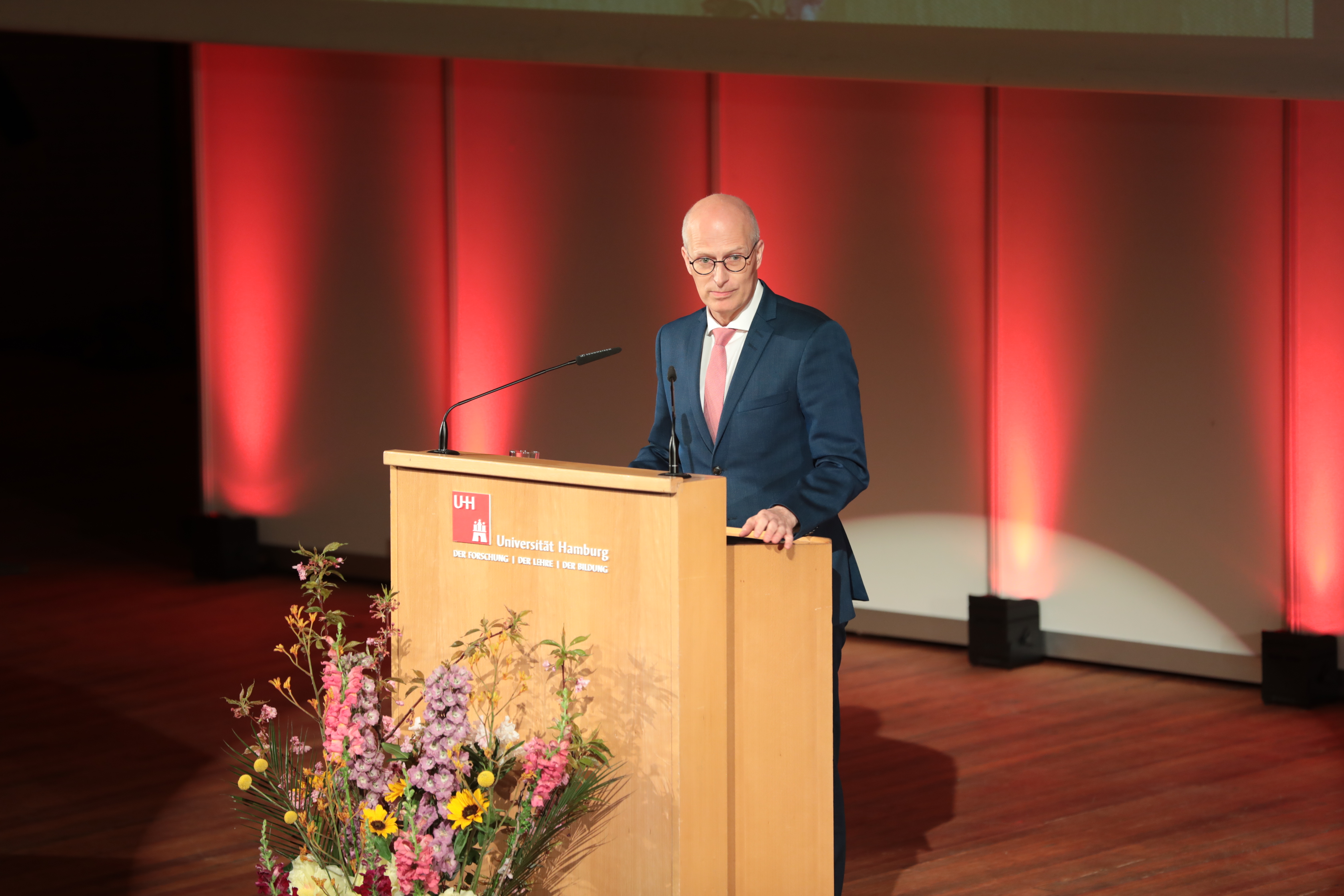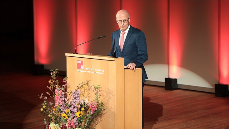 Bürgermeister Dr. Peter Tschentscher sagte in seiner Begrüßung: „Die Universität Hamburg ist mit 43.000 Studierenden und 12.800 Beschäftigten heute die größte Stätte der Forschung und Lehre im Norden. Sie ist das Flaggschiff der Wissenschaftsmetropole Hamburg und verbindet die Einrichtungen unserer vielfältigen Forschungslandschaft miteinander. Damit trägt die Universität dazu bei, die Potenziale des technischen und sozialen Fortschritts zu nutzen, um Lösungen für die drängenden Fragen unserer Zeit zu entwickeln.“