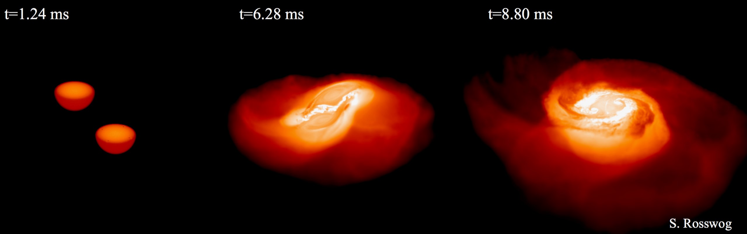 Umeinanderkreisende Neutronensterne erzeugen durch ihre extreme Materiedichte sogenannte Gravitationswellen, also Schwingungen der Raum-Zeit. Daneben wird durch die Kollision ein Teil ihrer Materie ins All geworfen. Es entsteht elektromagnetische Strahlung in verschiedenen Frequenzbereichen. „Die Herausforderung ist, sowohl die Gravitationswellen als auch die elektromagnetische Strahlung in eine einzige Modellierung zu integrieren, denn sie basieren auf völlig verschiedenen physikalischen Prozessen. Bislang wurden das Umeinanderkreisen der Neutronensterne bis zur Kollision und die Strahlung in separaten Modellen berechnet“, erklärt Stephan Rosswog. „Inzwischen sind wir aber soweit, dass wir beides zusammen modellieren können.“