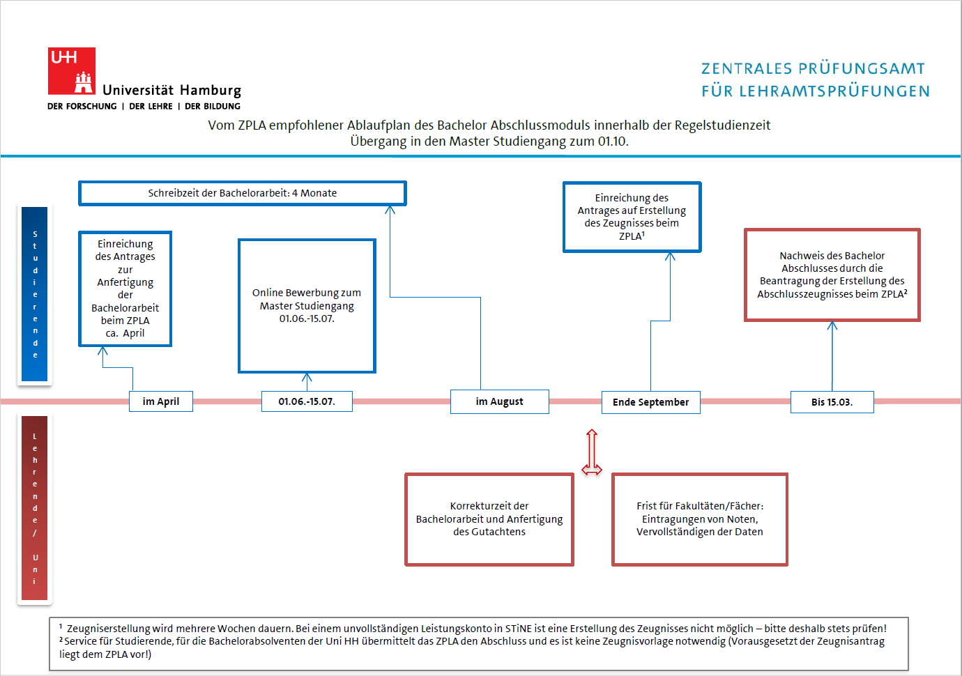 Bachelor-Studierende der Universität Hamburg, die nach einer erfolgreichen Bewerbung zum Masterstudiengang im Wintersemester vorläufig zugelassen wurden, werden automatisch endgültig in den M.Ed.-Studiengang übernommen, sofern Sie bis zum Ende des ersten Mastersemesters alle Studien- und Prüfungsleistungen im Bachelorstudiengang erfolgreich abgelegt haben und die Dokumentation im ZPLA vorliegt. Hierzu ist jedoch zwingend Ihr Antrag auf Erstellung eines Abschlusszeugnisses (PDF) vor dem 31.03. notwendig.