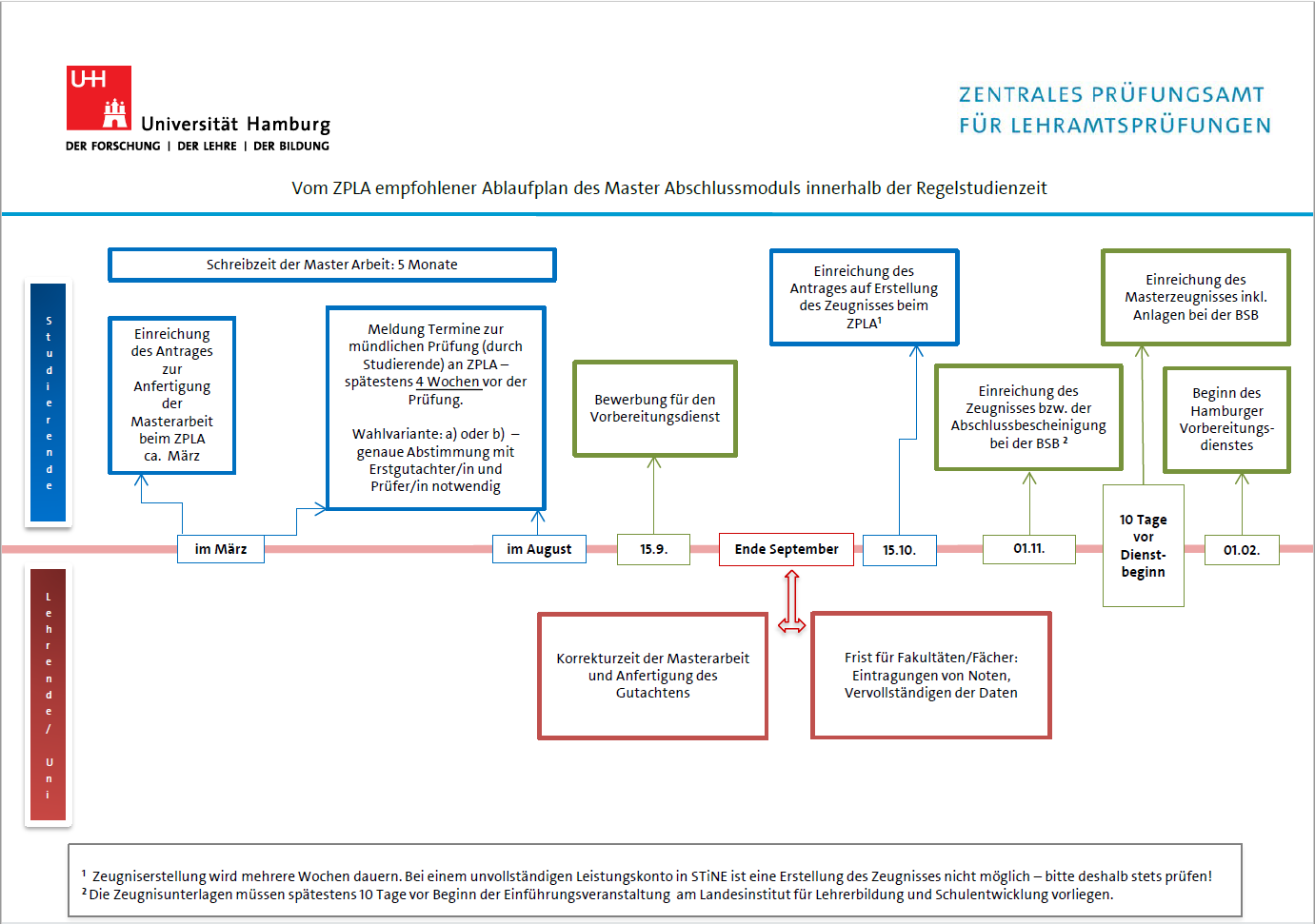 Wir haben einen Zeitstrahl (PDF) entwickelt, der zur Orientierung und Planung dient, damit Sie rechtzeitig Ihren Masterabschluss erreichen und sich termingerecht zum Vorbereitungsdienst bewerben können.